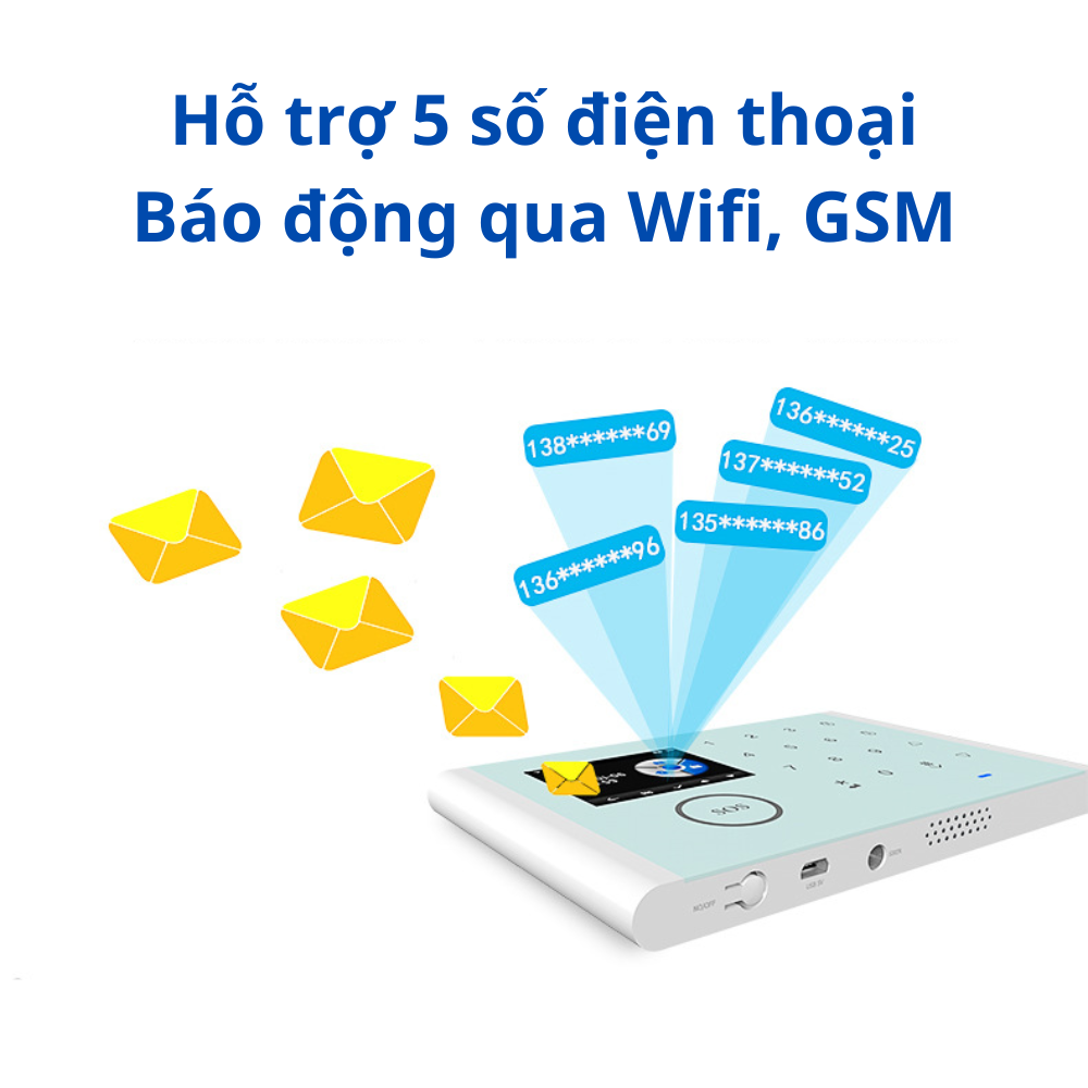 • Hỗ trợ 5 số điện thoại cài sẵn và số sms.