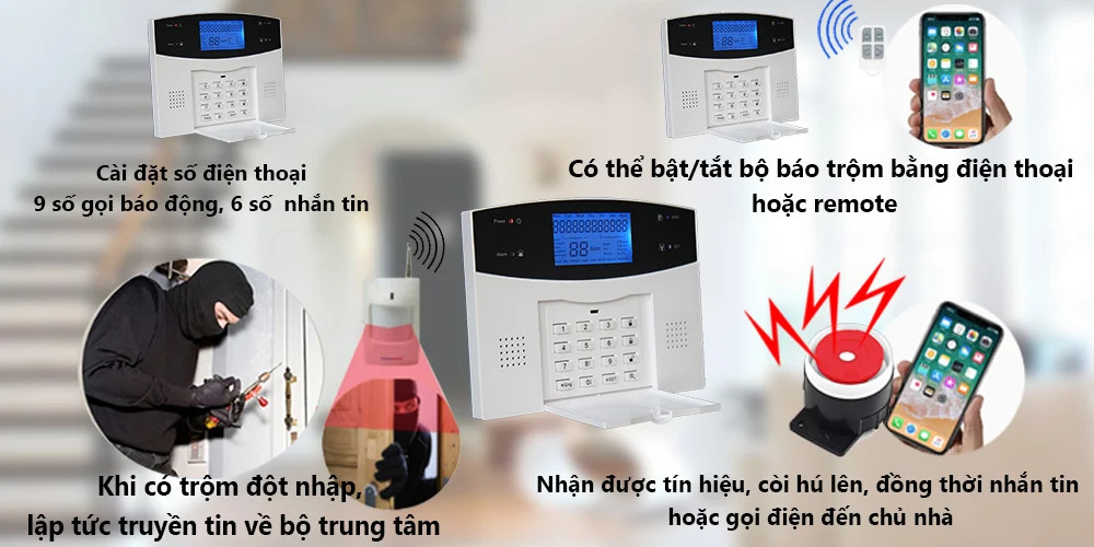 Khi hệ thống chống trộm ở chế độ mở, hệ thống sẽ dùng mắt hồng ngoại và cảm biến từ để bảo vệ ngôi nhà. Nếu mắt hồng ngoại phát hiện có người trong vùng bảo vệ hoặc cửa từ phát hiện nhà bị cạy cửa, chúng sẽ truyền tín hiệu về bộ điều khiển trung tâm. Lập tức trung tâm sẽ bật còi hú báo động, đồng thời điều khiển tự động gọi điện đến cho các số điện thoại đã cài đặt trước (Cài đặt được tối đa 9 số điện thoại gọi điện và 6 số điện thoại nhắn tin, bao gồm số di động, điện thoại bàn, các số khẩn cấp,..). Ta có thể dùng điện thoại để tắt báo trộm vào những thời điểm không thật sự cần thiết.