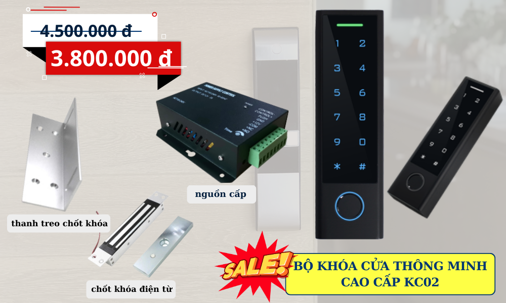 Bộ khóa cửa KC02 đã bao gồm đây đủ các thiết bị và phụ kiện đi kèm như khoa cửa, chốt khóa điện từ, thanh treo chốt khóa, nguồn cấp...