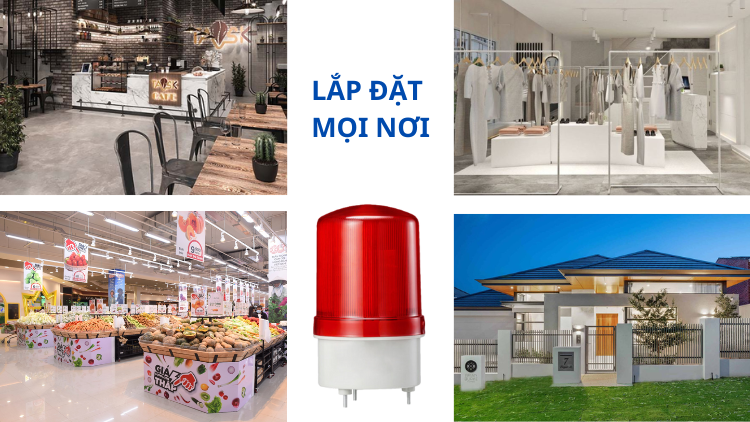 Ứng dụng: Còi hú kèm đèn chớp nháy báo động khi phát hiện trộm đột nhập (kết hợp cảm biến cửa, cảm biến hàng rào,..), hoả hoạn (kết hợp cảm biến khói gas) cho nhà ở gia đình, nhà máy, công trường, siêu thị,...