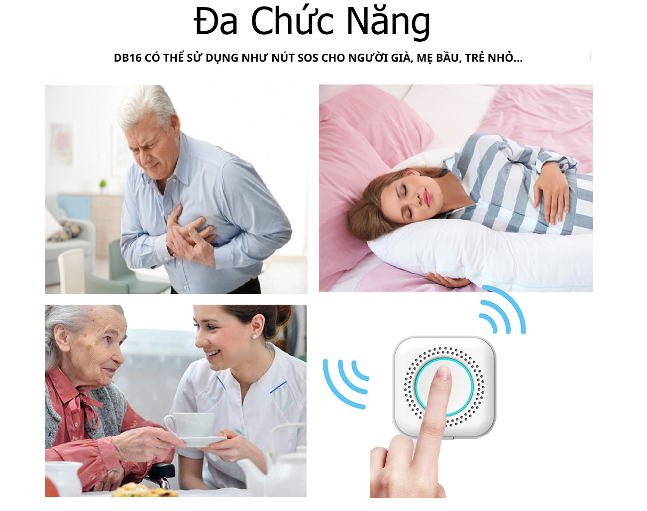 Bộ chuông cửa không dây DB16 với thiết kế nhỏ gọn dễ di chuyển bộ thu (những nơi có ổ cắm) cùng với đó là khả năng học lệnh kết hợp một nút bấm với nhiều chuông hoặc 1 chuông với nhiều nút bấm. Vì vậy, có thể sử dụng chuông ở trong bệnh viện, cơ quan, khách sạn…